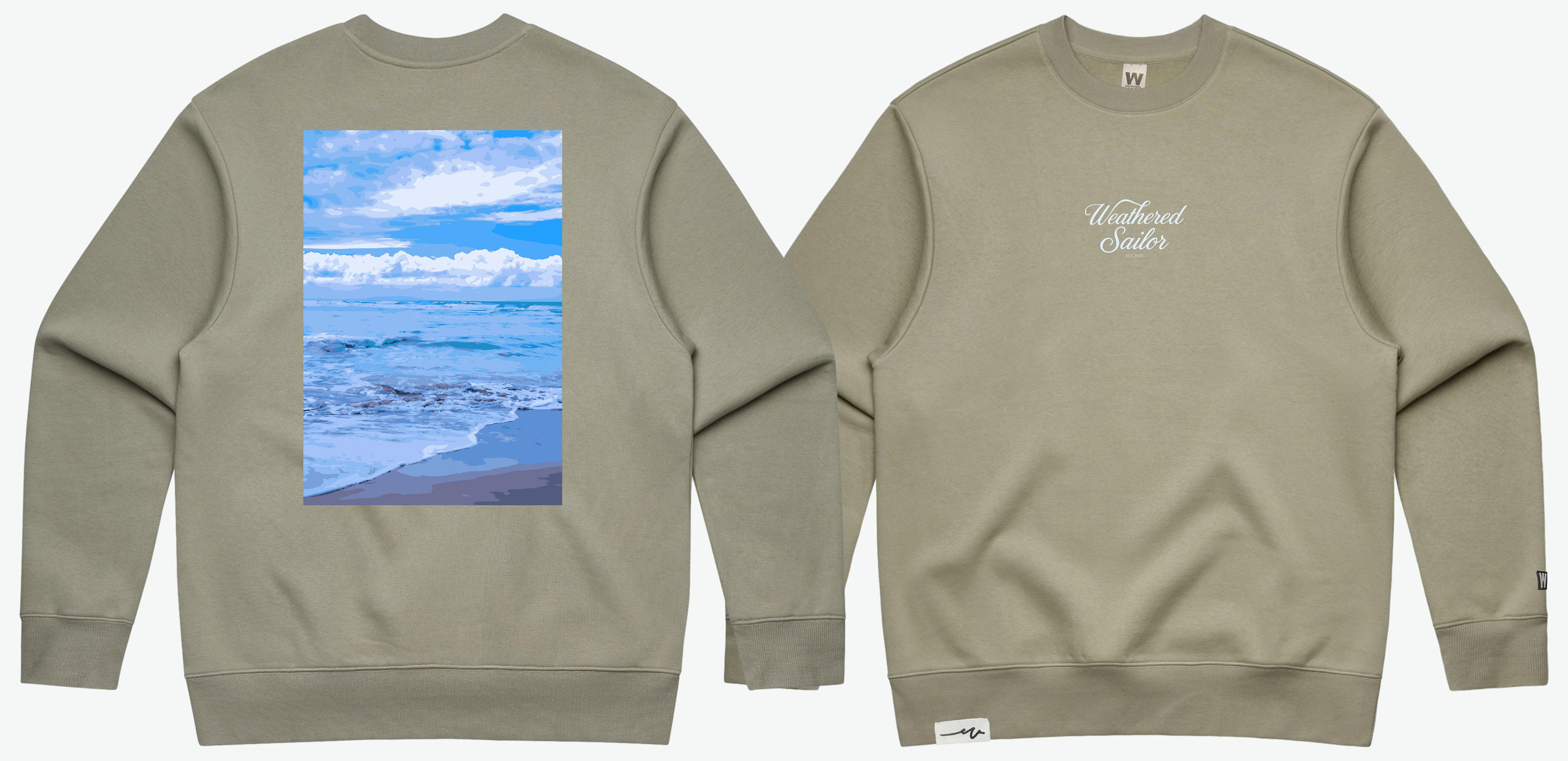 Puff-embroidered “Weathered Sailor” script centered on the chest — rendered in an understated driftwood beige.
