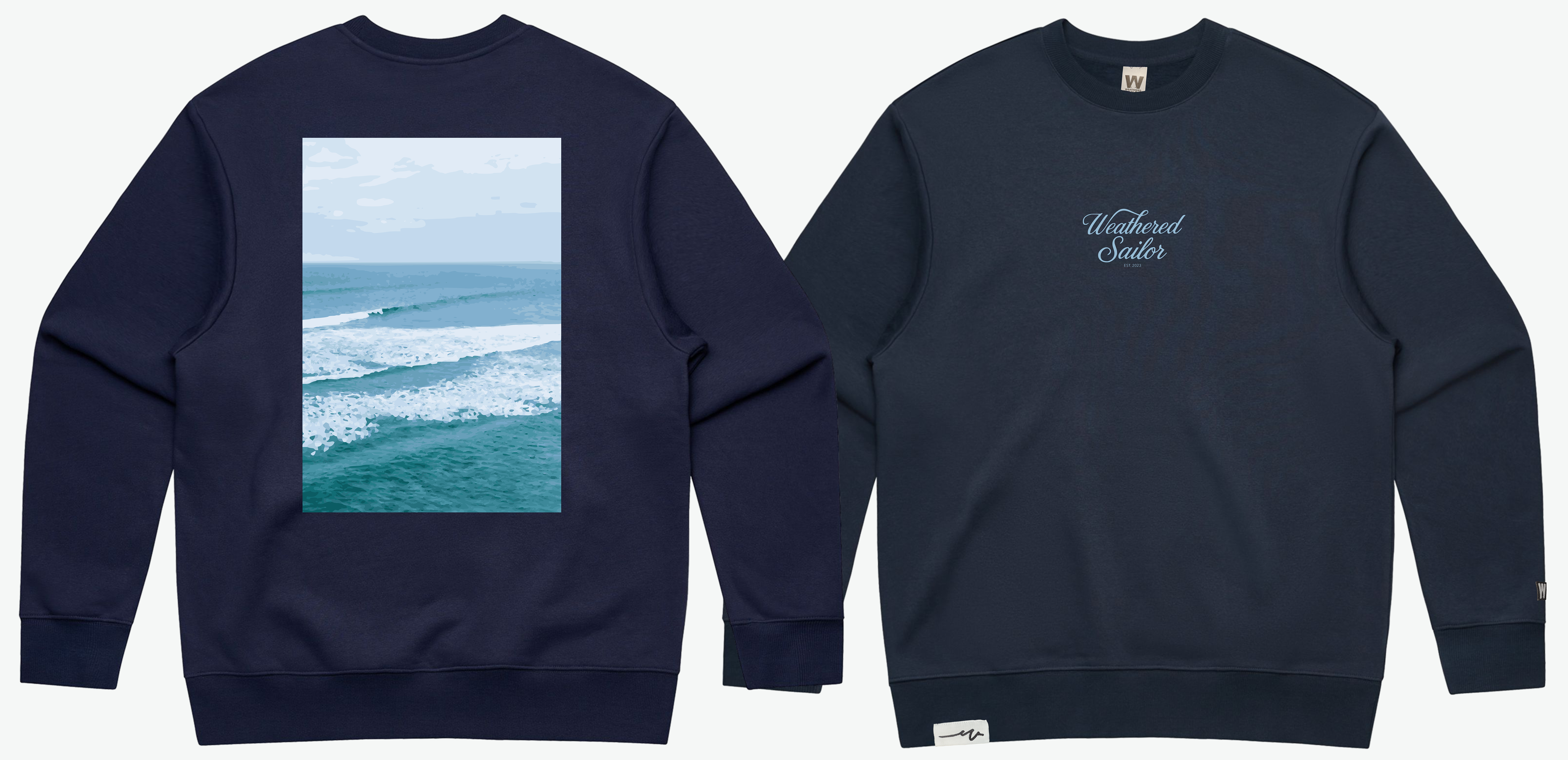 Center-chest puff-embroidered “Weathered Sailor” script — a vintage-inspired detail that adds timeless elegance to its modern silhouette.