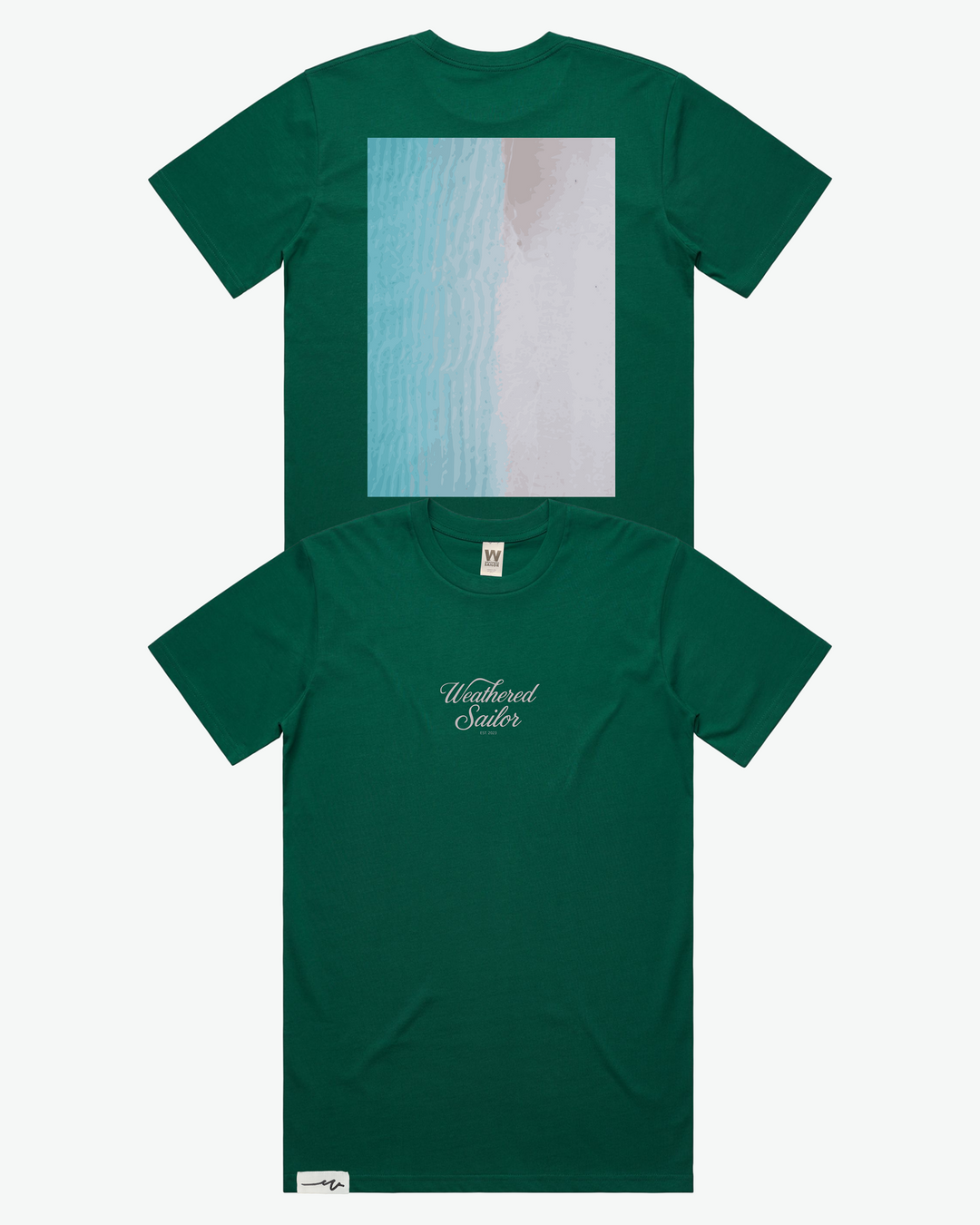 Man wearing green Weathered Sailor Supima OG W Tee with white 'W' logo on boat