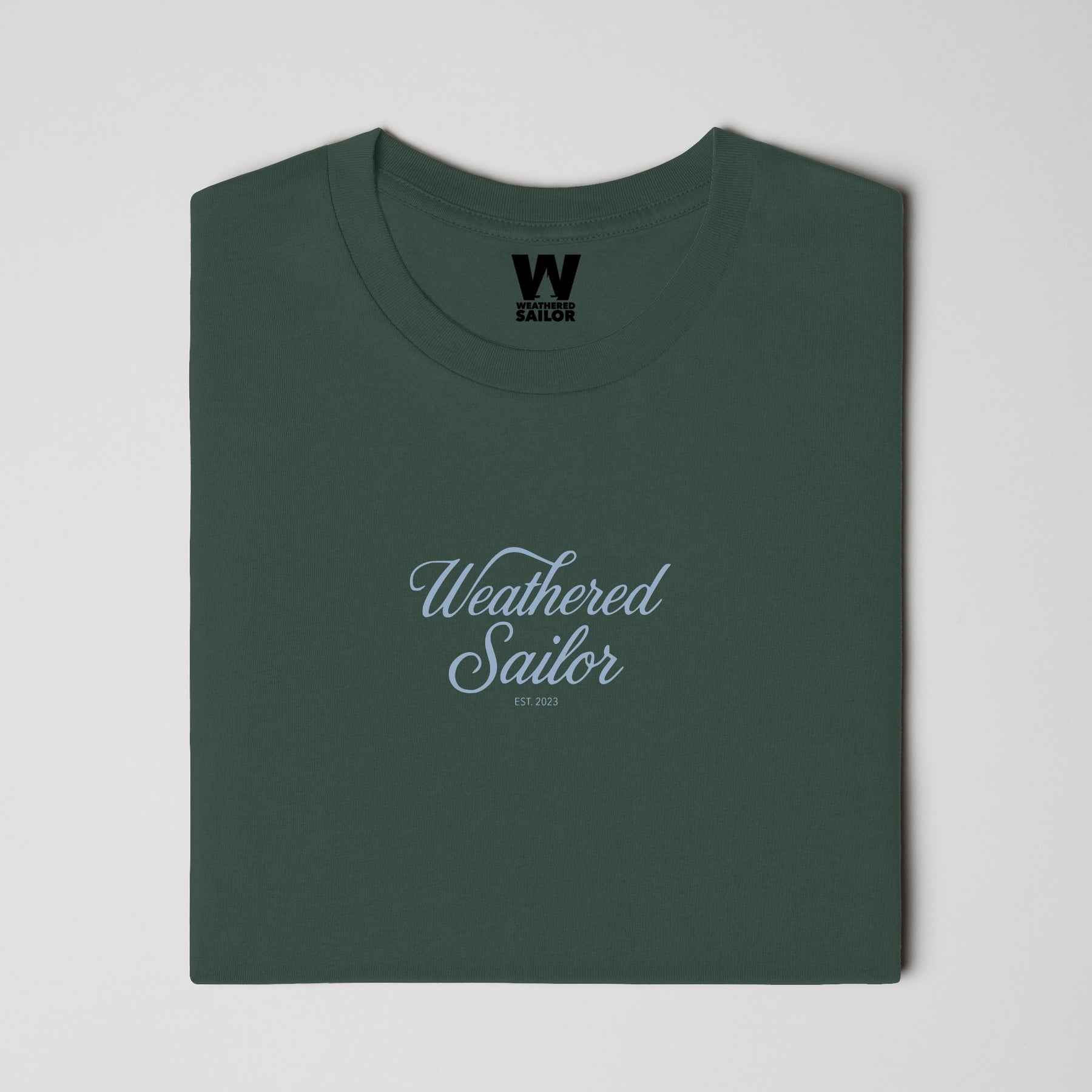 • Front Print: 5” Weathered Sailor EST. 2023 script DTF print in cool ocean blue