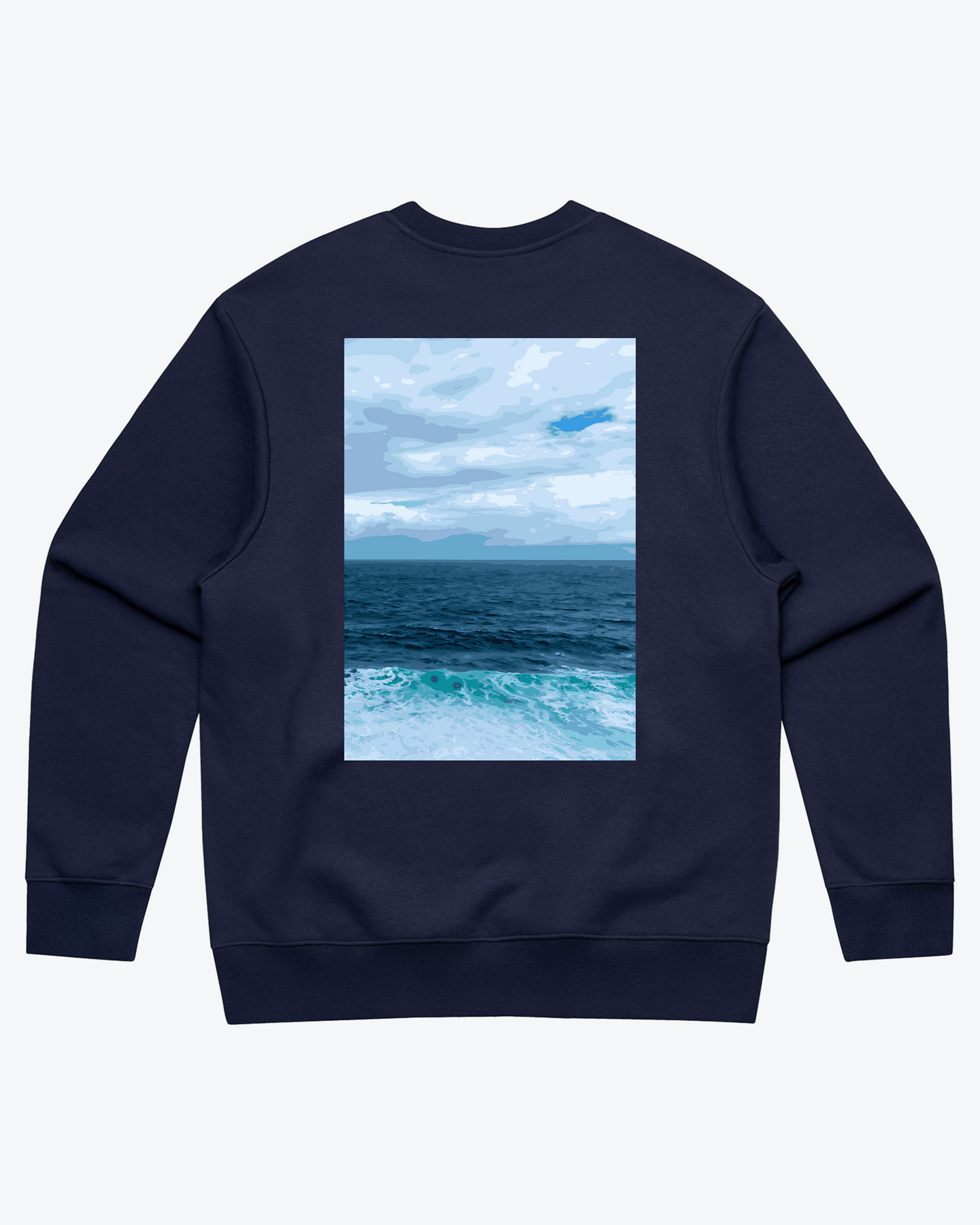 10” × 14” DTF artwork on the back — a wide, layered seascape where dark navy meets rolling aquas beneath a shifting sky.